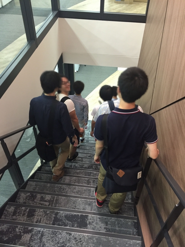 皆様まだ働いていらっしゃるなか、オフィス内を見学させていただき...各開発チームの方とご挨拶しつつ、社内の階段で5Fにも訪問させていただきました。フロアが分かれている場合の社内階段いいですねー、メンバーがわくわく降りて行ってます。フロアが分かれる場合、こういうの大事だと思います。
