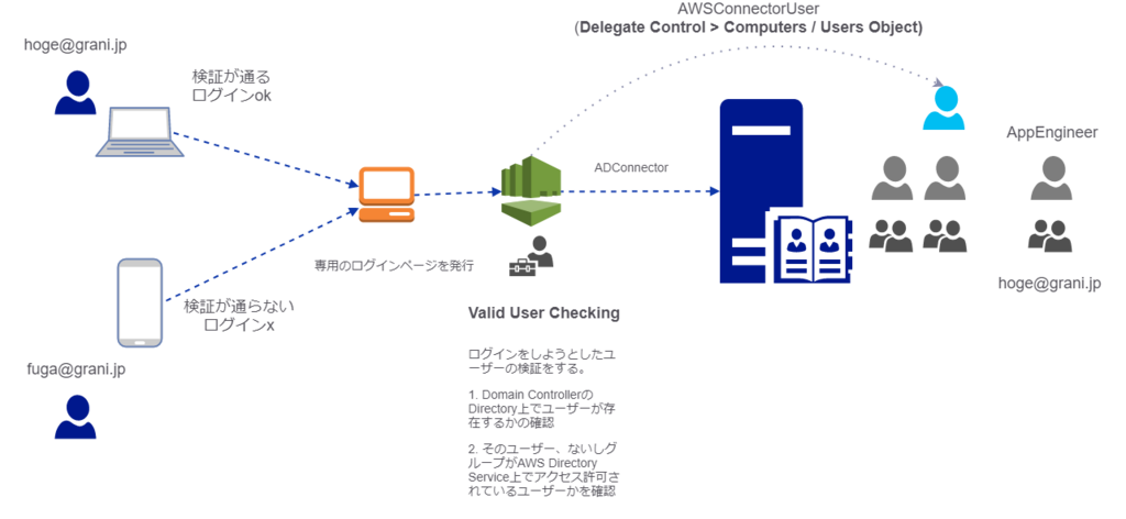 全体的なフロー図はこんな感じで、Active Directoryがすべての認証の要になっています。AWS Directory ServiceはADDC内部のディレクトリへの制御を委譲されているので、ユーザーの走査が可能です。(user/computer objectに対するread/write権限)