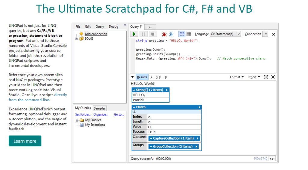 個人的に、LINQPadを使う良さの90%は .Dump() メソッドにあります。VSのローカル変数と同様にオブジェクトを覗きつつ次にメソッドをつなげることもできるので、ひじょーに強力です。