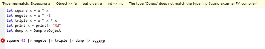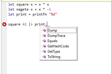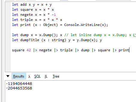 let add x y = x + y let square x = x * x let negete x = x * -1 let triple x = x * x * x let print (x : Object) = Console.WriteLine(x); let dump x = x.Dump(); x let dumpTitle (x : string) y = y.Dump(x); y square 42 |> negete |> triple |> dump |> square |> print