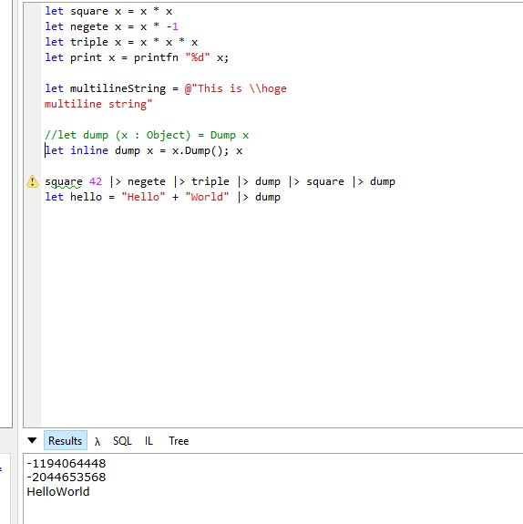 let dump x = x.Dump(); x // let inline dump x = x.Dump; x にするとコンパイル時に利用している型の分だけ関数が生成される (なんちゃってジェネリクス代わりにはなりそう let dumpTitle (x : string) y = y.Dump(x); y let titleDump = dumpTitle "れんしゅー" let hello = "Hello" + "World" |> dump hello |> dumpTitle "文字列" hello |> titleDump