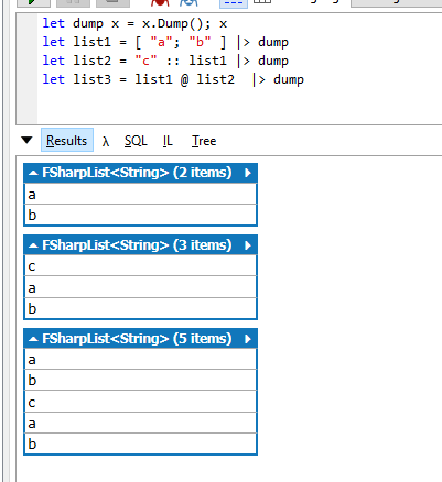let list1 = [ "a"; "b" ] let list2 = "c" :: list1 let list3 = list1 @ list2