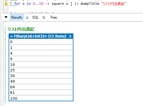 式が返ってました。[ for x in 0..10 -> square x ] |> dumpTitle "リスト内包表記"