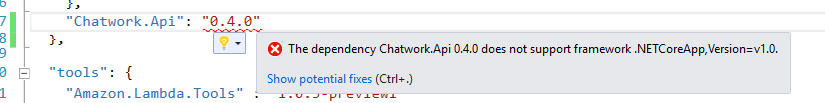 Package Chatwork.Api 0.4.0 is not compatible with netcoreapp1.0 (.NETCoreApp,Version=v1.0). Package Chatwork.Api 0.4.0 supports: portable-net45+win8+wp8+wpa81 (.NETPortable,Version=v