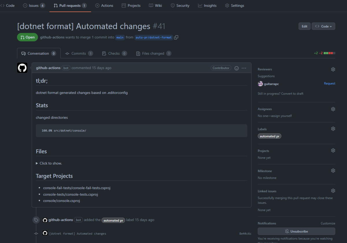 この記事で紹介するGitHub Actionsを使うと、dotnet formatされた結果がPRで上がってきます。